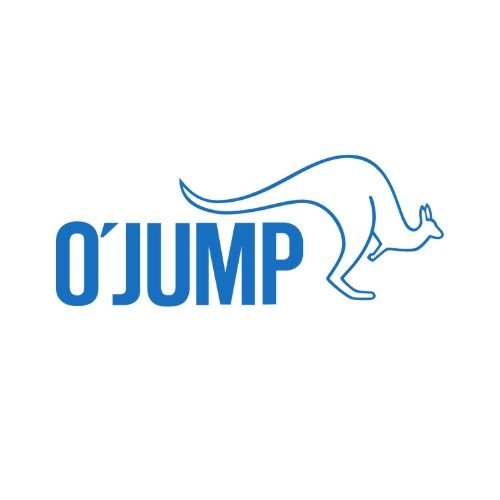 Logo with the word "O'JUMP" and an outline of a kangaroo in blue.